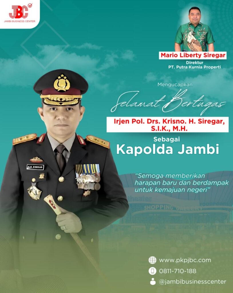 SIMPAR.ID – Jambi, 20 Maret 2025 – PT. Putra Kurnia Properti Proyek Jambi Business Center mengucapkan selamat kepada Irjen Pol. Drs. Krisno H. Siregar, S.I.K., M.H. yang baru saja dilantik sebagai Kepala Kepolisian Daerah (Kapolda) Jambi. Ucapan ini disampaikan secara khusus oleh perusahaan yang bergerak dalam pengembangan properti di Provinsi Jambi, sebagai bentuk dukungan dan harapan terhadap kepemimpinan baru di Polda Jambi.